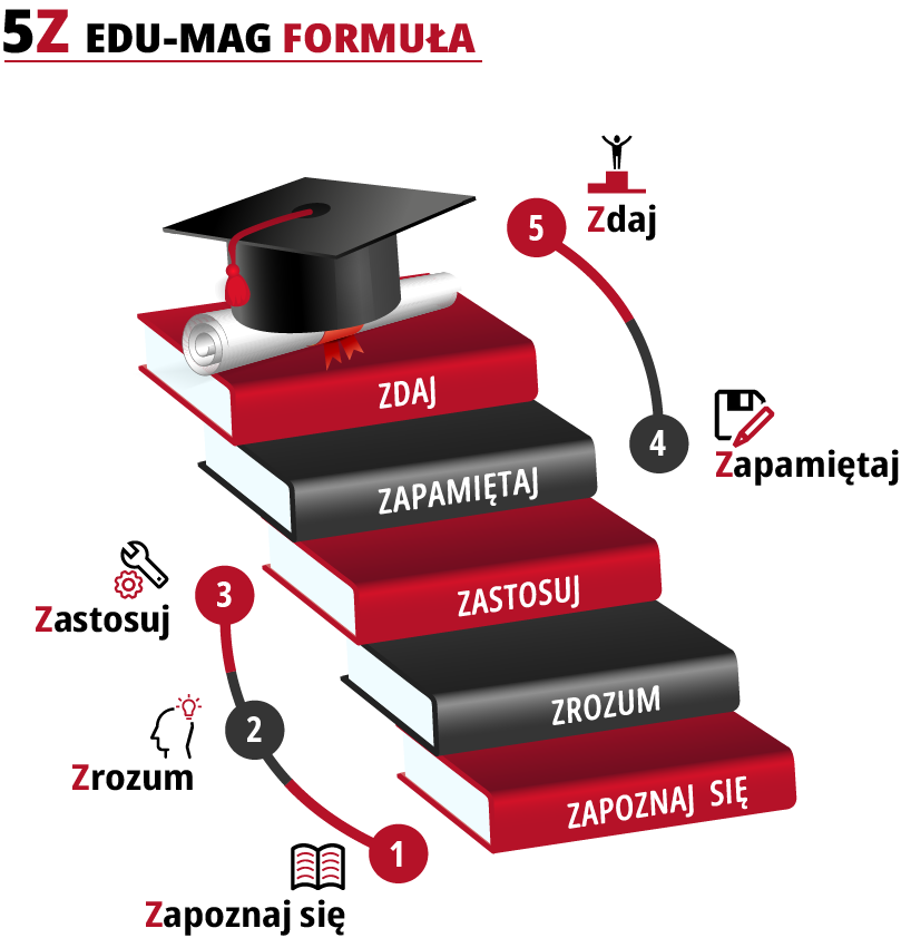 Wykorzystując wieloletnie doświadczenie w nauczaniu oraz wiedzę ekspertów skutecznego uczenia się, stworzyliśmy naszą autorską metodę uczenia 5Z EDU-MAG FORMUŁA. Składa się ona z 5 kluczowych etapów, które w procesie przyswajania nowych informacji są niezbędne. Dzięki nim nauka staje się szybka, łatwa i efektywna, a wiedza pozostaje w pamięci na długo.